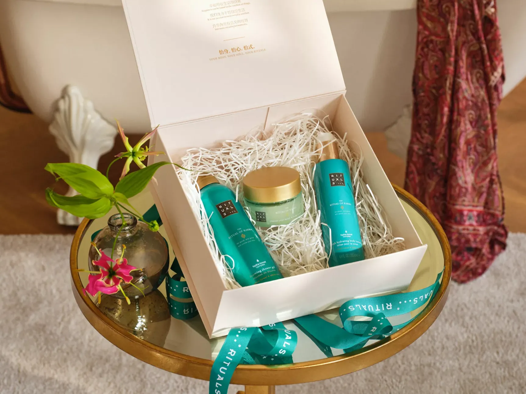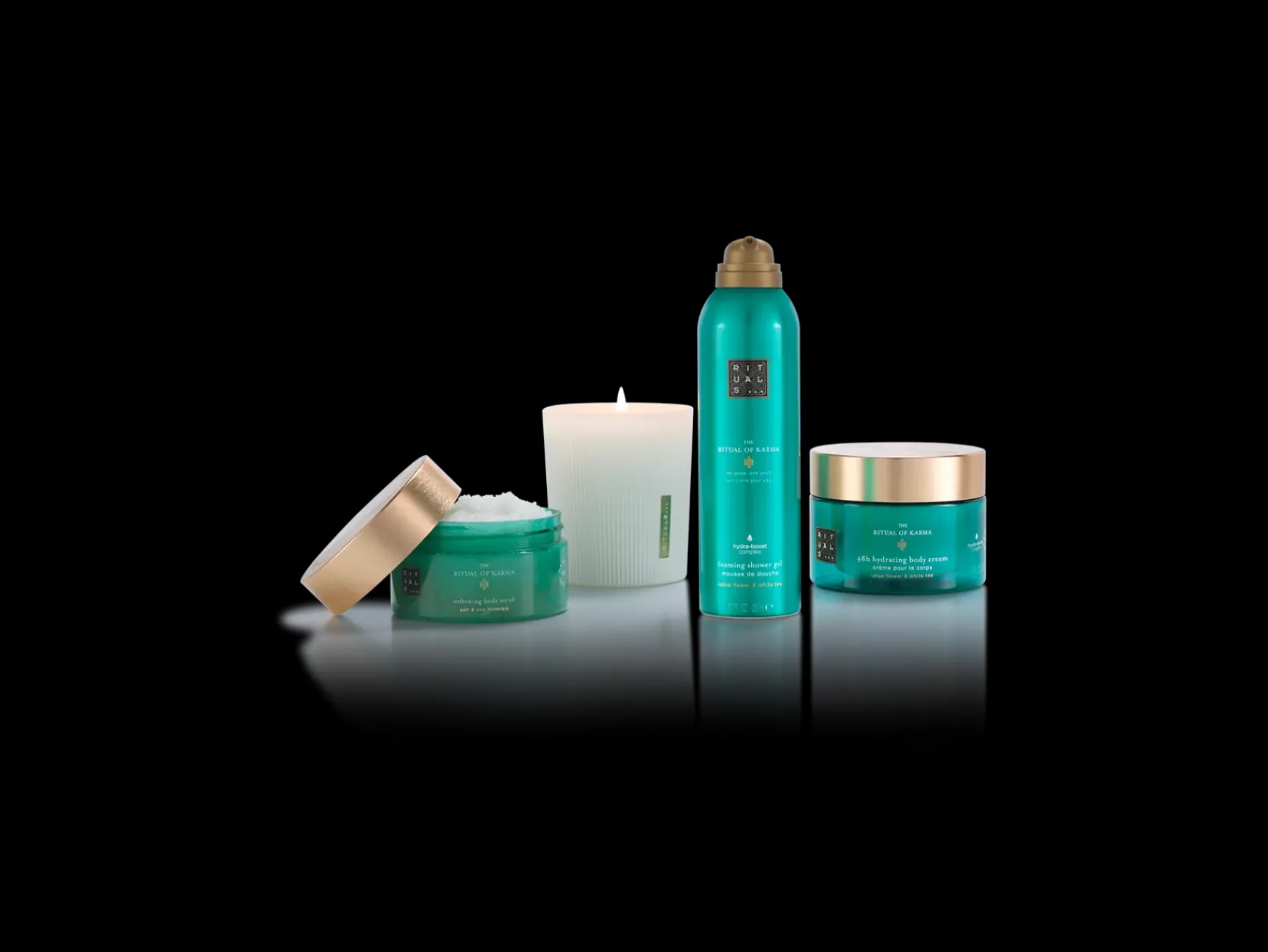 Gjør hver dusj til et sensasjonelt øyeblikk med The Ritual of Karma Foaming Shower Gel. Geléen er laget ved hjelp av en unik teknologi, og forvandles til et rikt, silkemykt skum for en fantastisk fuktighetsgivende opplevelse. Inneholder lotusblomst, hvit te og Hydra-Boost Complex. Dette komplekset er en blanding av tre effektive fuktighetsgivere: squalan, aloe vera og alger. Det er et unikt kompleks som bidrar til å berolige dehydrert og tørst hud for å gjenopprette hudens smidighet og elastisitet. Lotusblomsten symboliserer renhet, skjønnhet og visdom, og hvit te sies å skjerpe sansene. Kombinert skaper de en frisk, ren, grønn duft som gir en følelse av utstråling og positivitet.